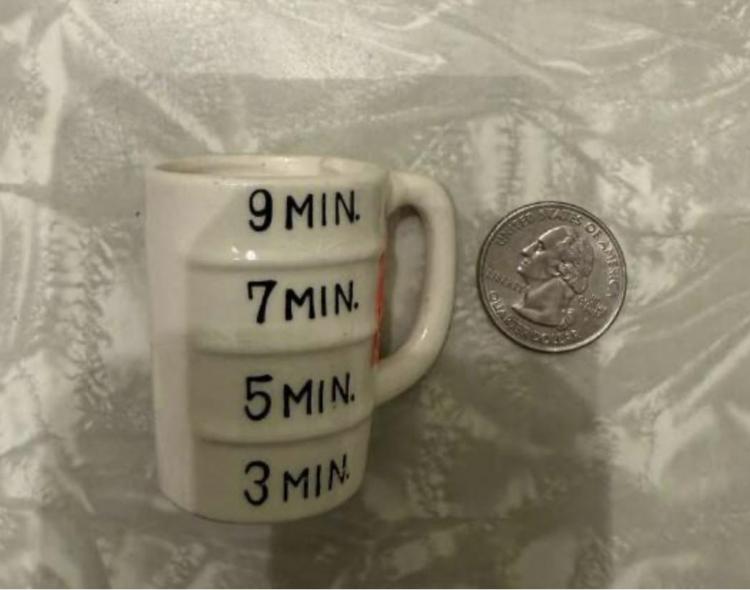 Це частина вінтажного набору електричної яйцеварки — чашка відміряє потрібну кількість води залежно від часу варіння.