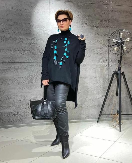 Шкіряні штани. Штани зі шкіри або екошкіри виглядають особливо виграшно, якщо мають прямий крій. Зазвичай їх поєднують із об’ємними светрами, а яскравим акцентом може стати масивна прикраса на шию.