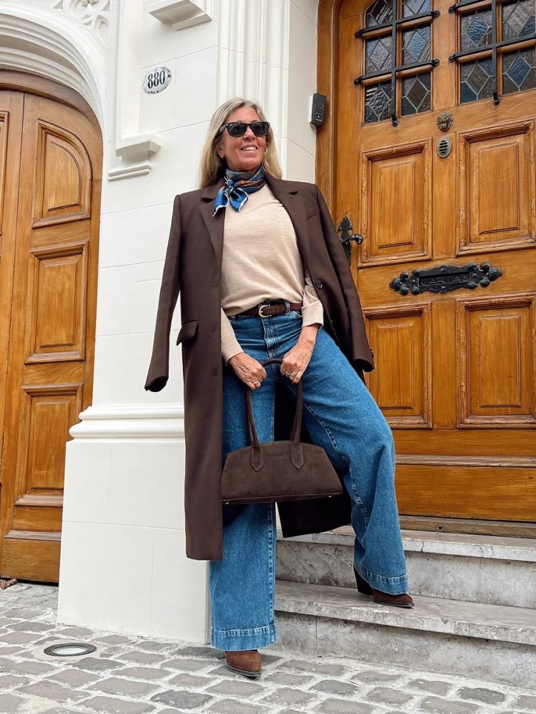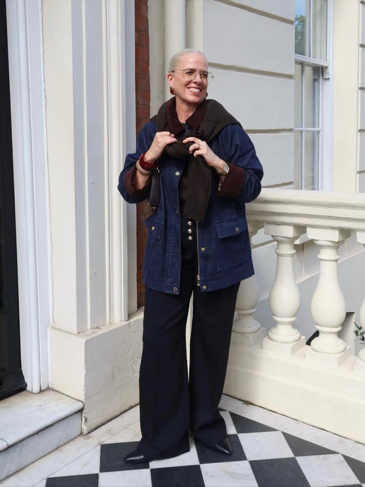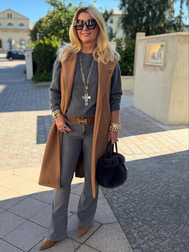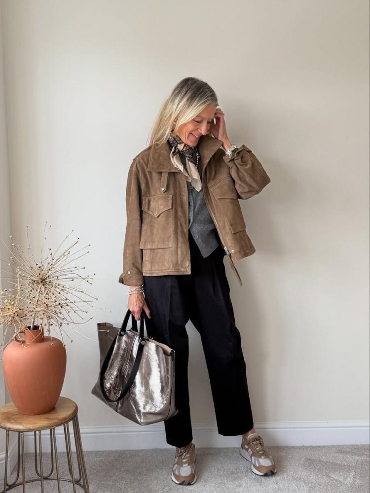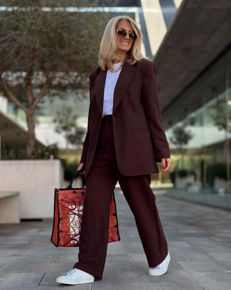 Краще обрати однотонний жакет прямого чи трохи вільного крою у нейтральному відтінку — сірому, темно-синьому чи пісочному. Такий фасон виглядає природно, сучасно й не додає віку.