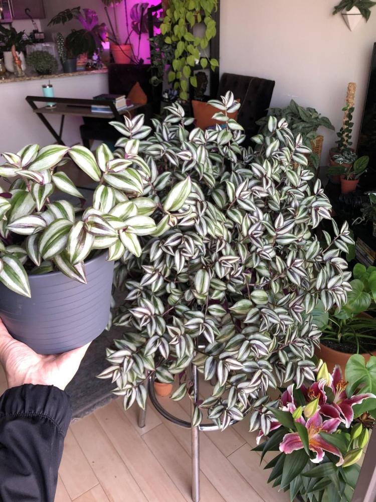 Щоб традесканція залишалася густою, її потрібно регулярно прищипувати. Кожен зріз над листковим вузлом стимулює появу нових пагонів. Так замість довгих тонких гілок утворюється щільний каскад. Прищипуйте пальцями або ножицями, особливо навесні й улітку, коли рослина росте найактивніше. Без цього вона швидко втратить форму.