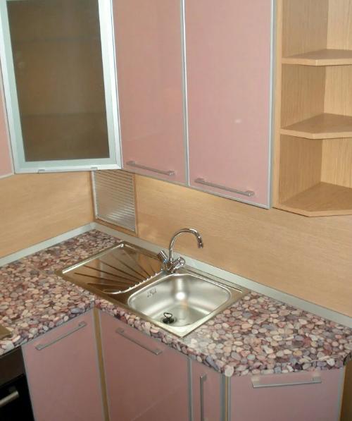 Гарнітур обрали ніжного лілового відтінку. Він має скошену по кутах форму, що дозволяє розмістити більше полиць для зберігання речей і посуду.