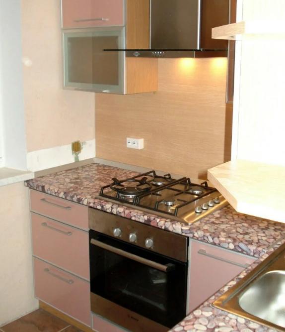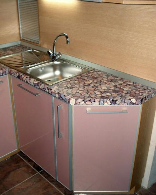 Стільниця розташована по периметру стіни. Вона має своєрідний строкатий візерунок, що нагадує гальку. Може здатися, що це сумнівне дизайнерське рішення.