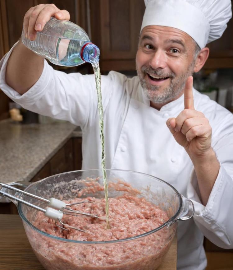 Ще один цікавий прийом — подрібнений лід. Він охолоджує фарш і допомагає сформувати правильну, пружну структуру.