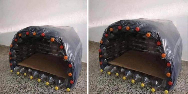 Спершу я розклав пляшки у два ряди, щоб утворити основу. Потім поступово формував «стіни» і «дах», з’єднуючи пляшки скотчем. У мене вийшов своєрідний тунель — схожий на маленький намет.