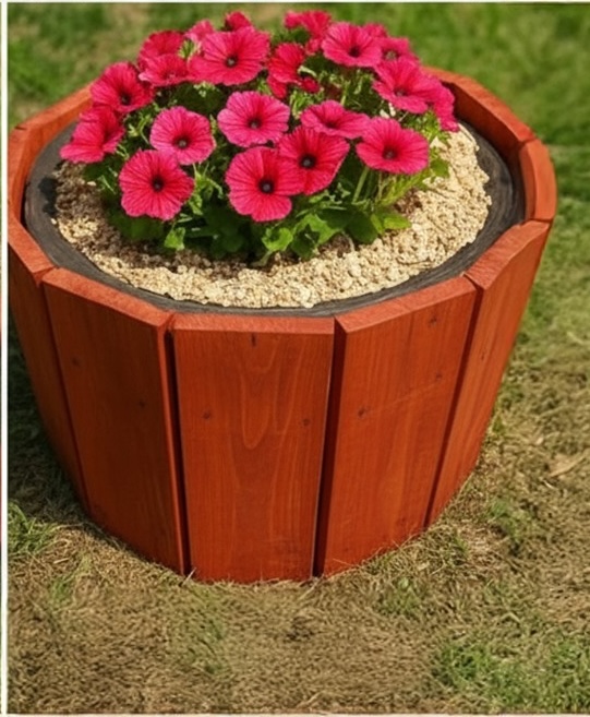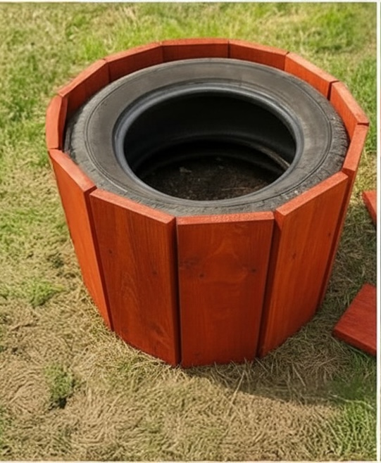 Щоб надати клумбі охайного вигляду, я вирішив обшити її дерев’яними елементами. Використав рівні дошки шириною близько 10 см. Нарізав їх так, щоб вони повністю закривали висоту двох шин. Після цього зашліфував і покрив деревину морилкою — вибрав теплий теракотовий відтінок, який добре гармонує із зеленню.