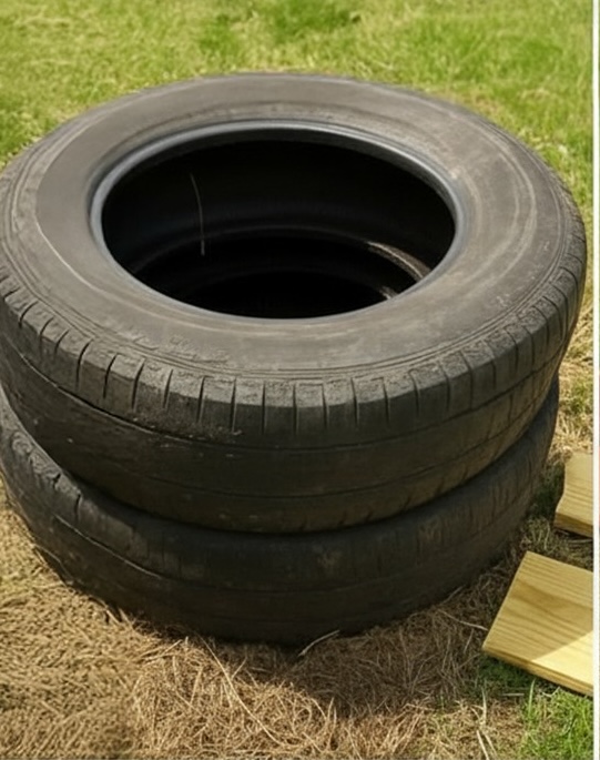 Я взяв дві однакові автомобільні шини і встановив одну на одну прямо на землю. Так конструкція виходить вищою й місткішою для ґрунту. Перед тим очистив їх від пилу та бруду — так працювати набагато приємніше.