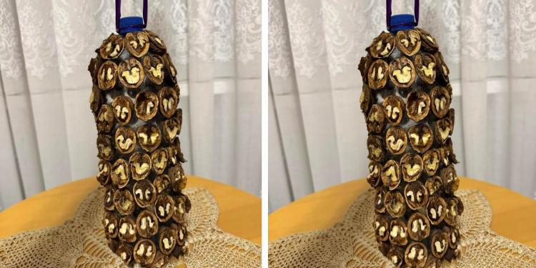 Я давно хотів зробити щось корисне для птахів узимку, але не стандартну дерев’яну годівничку, а щось простіше, екологічніше й естетичніше. Так з’явилась ідея зробити вертикальну годівничку з пляшки та волоських горіхів. Вона виглядає як арт-об’єкт, але водночас є повноцінним джерелом корму для птахів.