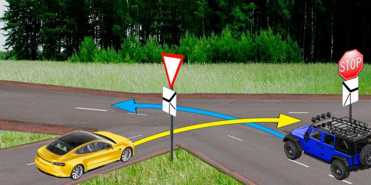 Висновок: першим проїде синій позашляховик (праворуч). Другим — жовтий автомобіль.