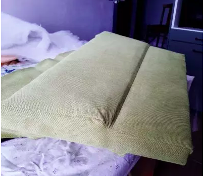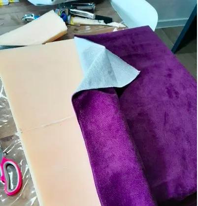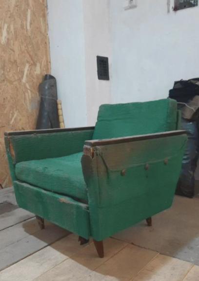 Будь-який проєкт переробки починається з демонтажу. Проаналізувавши необхідну кількість тканини, я дійшла висновку, що мені знадобиться 2 метри 40 сантиметрів. Для оббивки я обрала тканину оливкового кольору. З цим кольором у мене окрема любов.