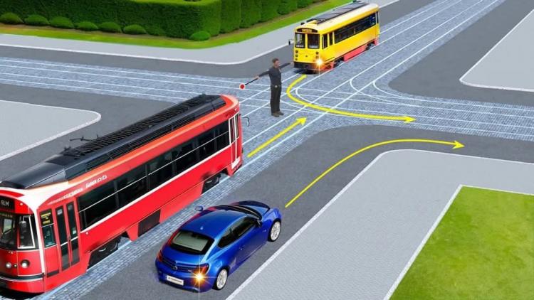 Правильна відповідь: Червоному трамваю і синьому автомобілю.