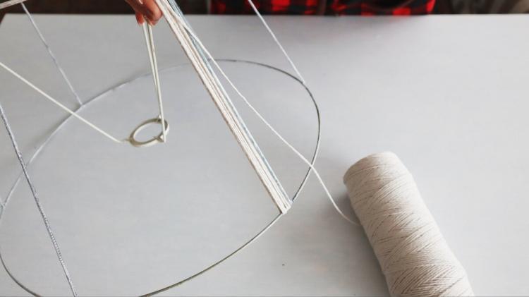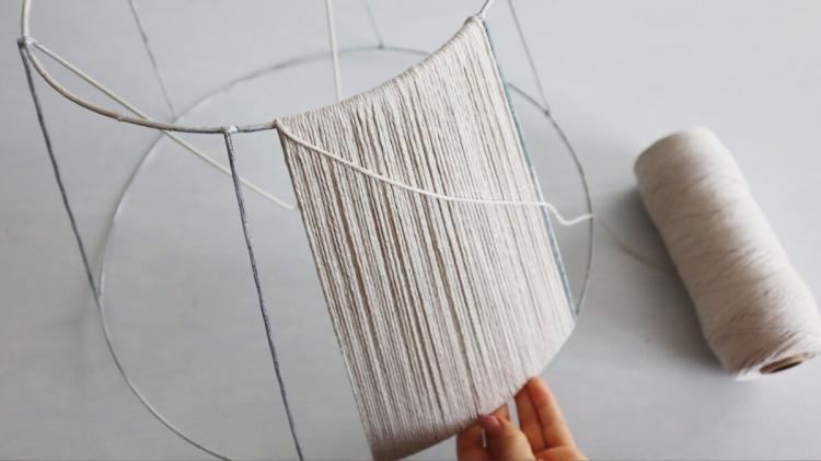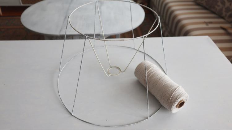 Щодо самого абажура, варіантів оздоблення безліч: можна обтягнути його тканиною, додати вишивку, бусинки, мереживо, стрічки, обв’язати гачком, використати картон, штучні квіти, сплести макраме… Але я зупинилася на своїй ідеї — вирішила оплести каркас мотузкою.