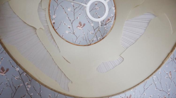 Абажур у мого торшера теж із дрібними плісировками, а всередині був тонкий пластик, який за роки повністю розсохся і розкришився. Я вирішила його переробити.