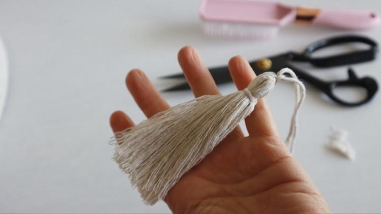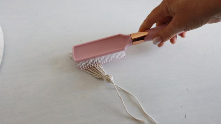Вирізала з картону заготовку довжиною 12 см, намотала на неї по 12 витків шпагату й перев’язала посередині. Потім кожну китицю розчесала масажною щіткою, щоб вона була пухнастою, і прив’язала до каркасу через кожні дев’ять ниток.