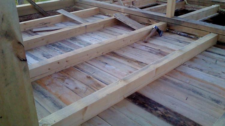 Для початку ми зробили чернову підлогу, яка провітрюється знизу і бере на себе перший удар холоду. Її основу складає звичайна фанера, закріплена знизу до масивних дерев’яних балок. Балки встановлюються «на ребро» — це додає міцності конструкції й створює глибокі порожнини для утеплювача. Турбуватися про «містки холоду» не доводиться: 30 см дерева чудово ізолює приміщення від холоду, а додаткова фанера з обох боків повністю усуває ризик промерзання.