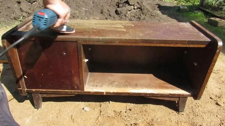 Поки я займалася миттям скляних елементів, чоловік узяв болгарку з лепестковим диском і повністю зняв старий лак та фарбу. Потім він вирівняв поверхню за допомогою шліфувальної машини з дрібнозернистим диском.