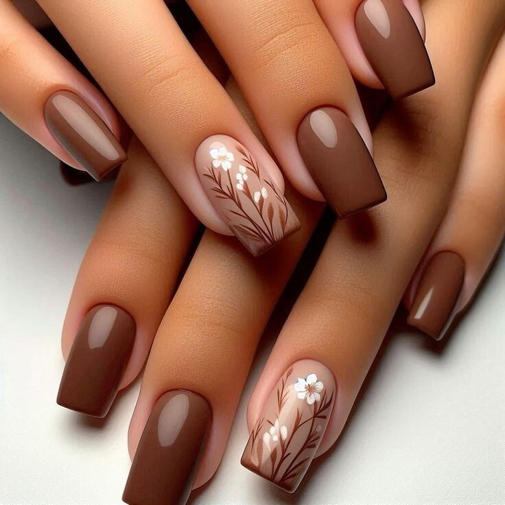 Теплі насичені відтінки кави підкреслюють елегантність рук і чудово пасують як до ділового стилю, так і до романтичного образу. Невеликий білий малюнок квітки на одному нігті додає ніжності й контрасту.