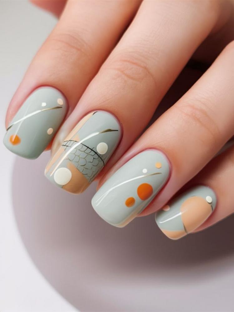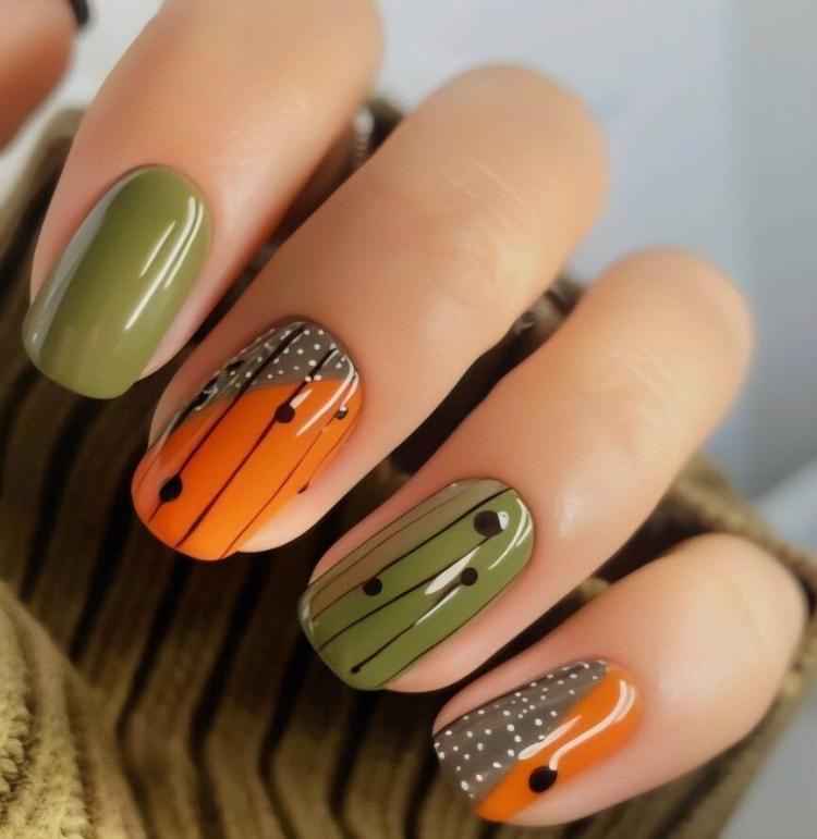5. Яскравий нейл-арт у зелених, сірих і помаранчевих тонах