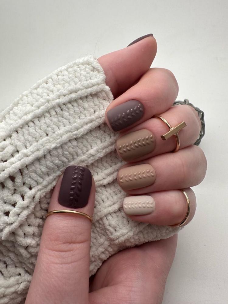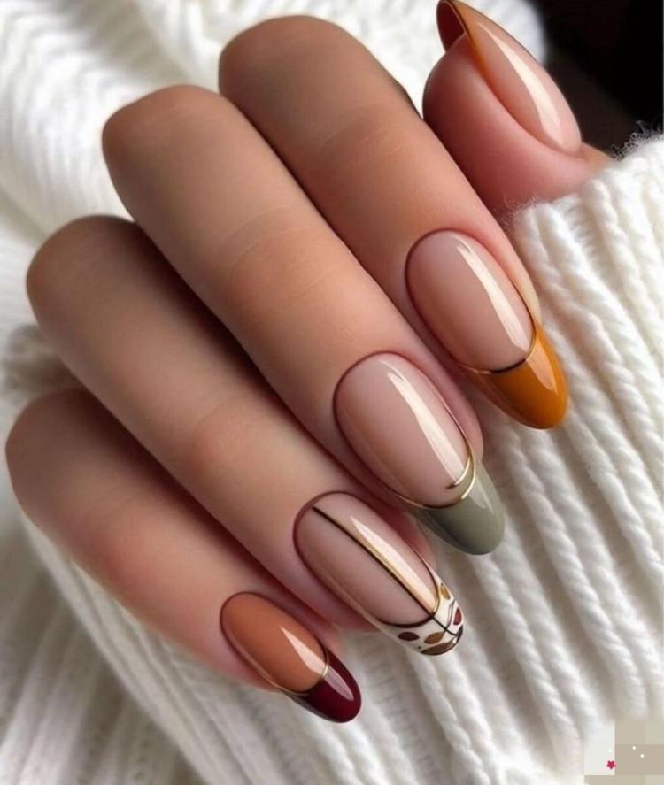 Кінчики нігтів, пофарбовані в м’які осінні кольори — оливковий, бордовий, теракотовий — виглядають неймовірно ефектно. Декор у вигляді тонких золотистих ліній і невеликих листочків робить дизайн витонченим і сучасним.