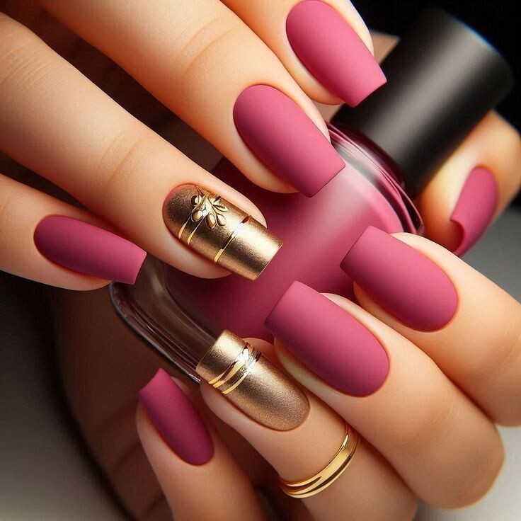 Базовий рожевий колір у поєднанні з вишуканими золотими лініями чи гілочками створює ефект спокійної розкоші. Такий дизайн гармонійно поєднує стриманість і елегантність.