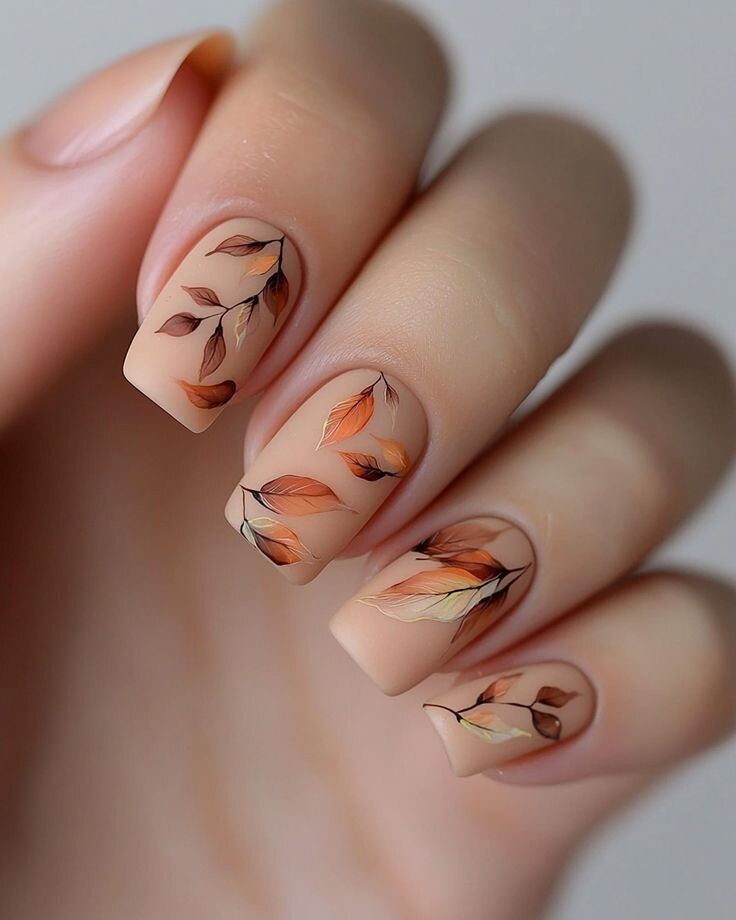 Якщо хочеться додати осіннього настрою, але без зайвої яскравості, цей варіант — саме те. Тонкі малюнки осіннього листя на прозорій або бежевій основі виглядають дуже делікатно й пасують будь-якому образу.
