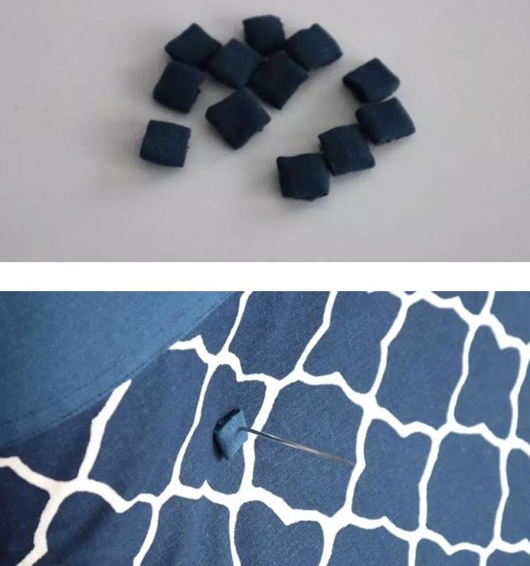 Із залишків тканини я вирізала невеликі квадратики та пришила їх з обох боків, закріпивши чохол до каркаса за допомогою великої циганської голки.