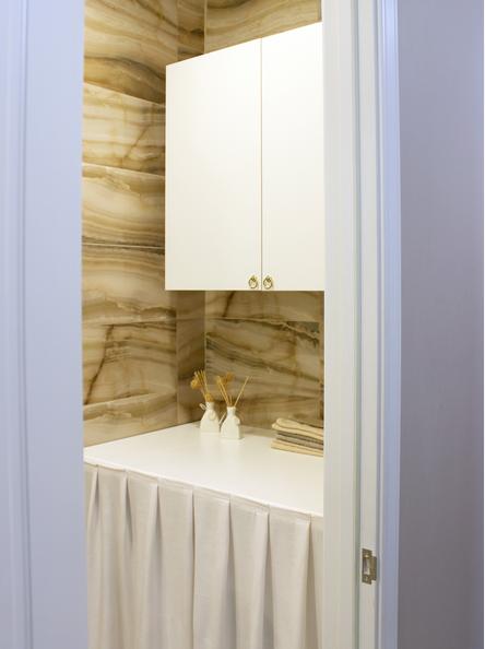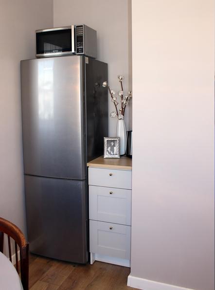 Під час встановлення нових перегородок продумали нішу для холодильника й невелику тумбу.