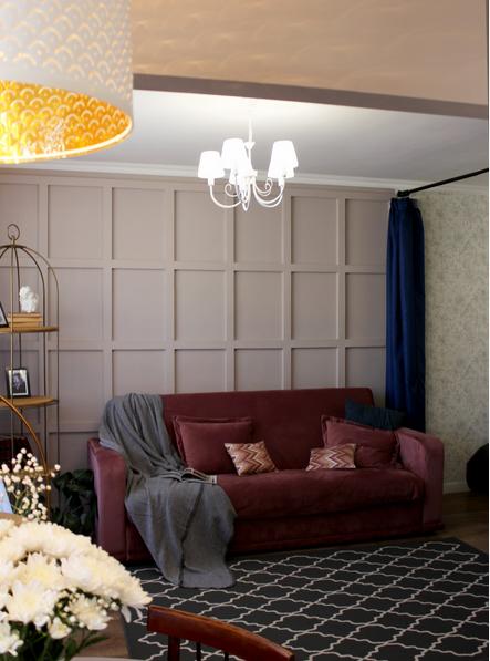 Несучі стіни вирівняли за маяками, поштукатурили й зашпаклювали. У вітальні, кухні та коридорі наклеїли склохолст, а одну зі стін за диваном вирішили оформити цікавіше — поєднали фанеру з вагонкою. Зону телевізора виконали в тому ж стилі. Усе покрили якісною миючою фарбою.