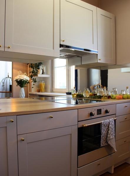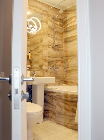 Під час монтажу нових перегородок із гіпсокартону на металевому профілі з шумоізоляцією ми трохи розширили простір кухні та санвузла. Повністю оновили електропроводку, систему опалення й водопостачання.