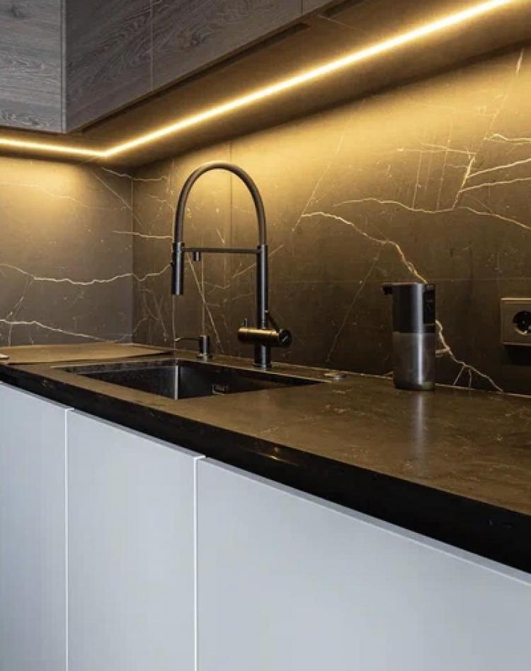 Альтернатива — технологія платформінгу: спочатку встановлюють стільницю, потім фартух із керамограніту, а шов між ними обробляють герметиком. Виглядає охайно та стильно.