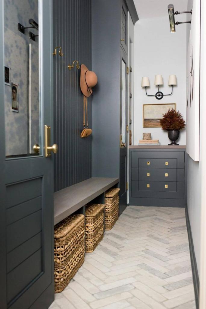 Подивіться, як ефектно виглядає інтер’єр із великими золотими гачками на тлі насичено-синіх стін. Таке поєднання кольорів надає вишуканості, а доповнення у вигляді світильників і декоративних елементів створює атмосферу розкоші. Залишиться місце навіть для невеличкої лавочки чи стільця, під якими можна облаштувати додаткове місце для зберігання.