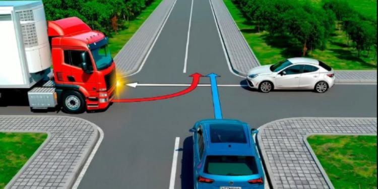 Білий автомобіль: Дивимося праворуч від нього — там порожньо (вантажівка для нього не є перешкодою справа). Білий автомобіль проїжджає першим.