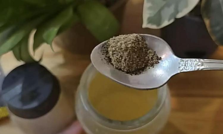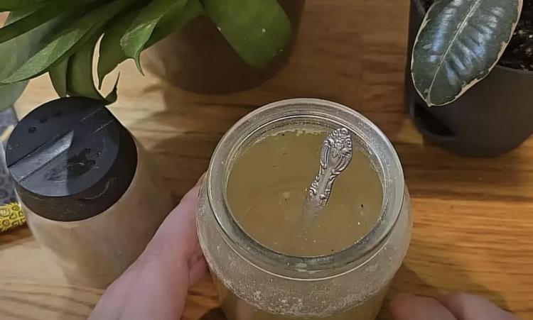 У скляну банку наливаю воду, додаю куркуму та добре розмішую. Куркума — це справжній природний імуномодулятор для рослин: зміцнює їх, допомагає боротися зі шкідниками, грибком і сприяє швидкому укоріненню після пересадки.