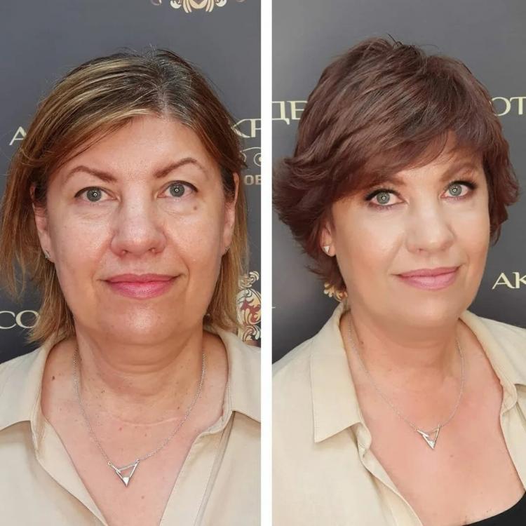 Дивлячись на фото «до», мимоволі спадає на думку фраза «жінка зі слідами колишньої краси». Але після роботи майстра перед нами — ефектна дама середніх років. І її краса не «колишня», а цілком реальна. Виразний макіяж очей, тепліший відтінок волосся та трохи змінена форма стрижки зробили справжнє диво.