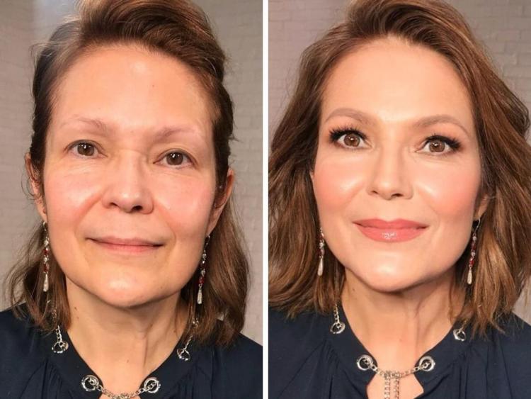 Перша героїня — приваблива жінка, якій бракувало лише трохи свіжості. Основний акцент зробили на очі: легке сяйво шкірі додали за допомогою хайлайтера, брови акуратно підкреслили, зберігши їхню природність. Світлі тіні у внутрішніх куточках «відкрили» погляд, а довгі вії зробили колір очей виразнішим. Помада натурального відтінку візуально надала губам об’єму — і перед нами жінка, яка виглядає значно молодшою за свій вік.