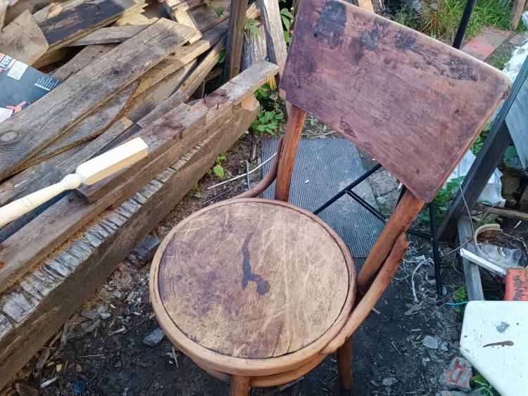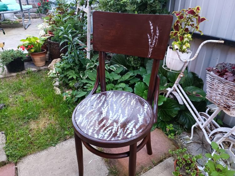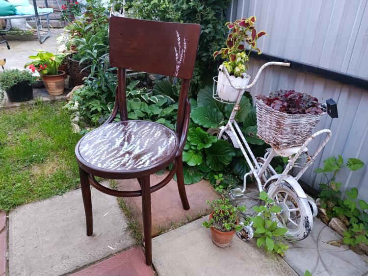 Буквально в останній день перед від’їздом з дачі я таки встигла взятися за старий стілець у стилі «псевдовіденський» і довести його до ладу. Колись я не змогла пройти повз, коли побачила його біля смітників: нічого особливого, але чомусь шкода стало. Так він і простояв кілька років, чекаючи свого часу. І цього літа руки до нього теж не доходили — аж поки не настав той самий останній момент.