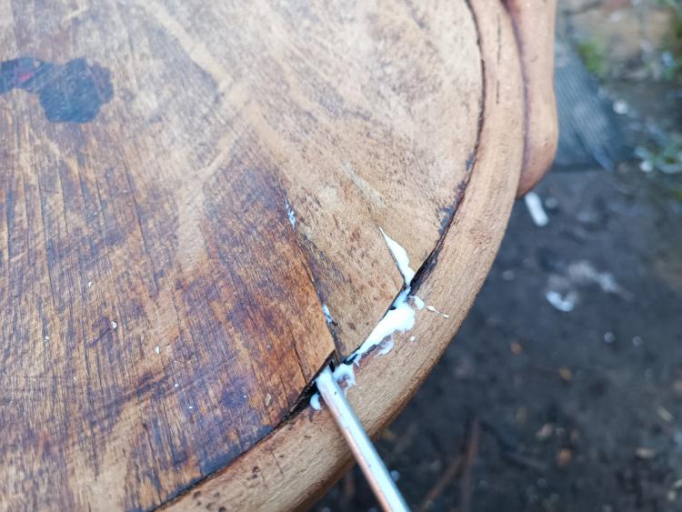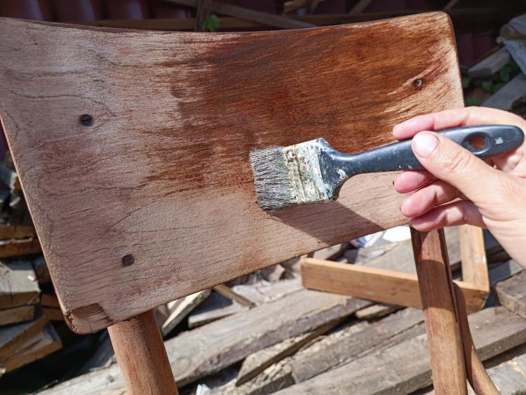 Тож довелося додатково пройтися шліфмашинкою. Повністю прибрати темні в’їдені сліди так і не вдалося, але вигляд став значно охайнішим. Відійшовший шпон на сидінні я приклеїла звичайним ПВА, добре стягнула струбцинами й залишила так на добу. А місце, де на спинці не вистачало шпону, просто зашліфувала до плавного переходу.