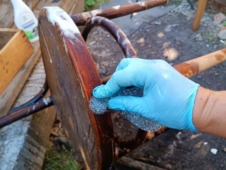 Сам стілець був міцний, проте добре «пожитий». На спинці бракувало шматочка шпону, а на сидінні він місцями розшарувався. Спершу я ретельно відмила поверхню від старого покриття — скористалася звичайним кухонним знежирювачем і металевою губкою.
