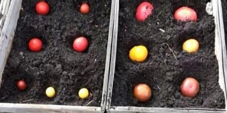 Наприкінці жовтня або на початку листопада, коли вже вдаряють перші заморозки, я в городі викопую лунки глибиною приблизно 15–20 см. У кожну лунку кладу цілий помідор — так, саме цілий! Потім засипаю його землею, злегка утрамбовуючи. Важливо, щоб зверху залишалося приблизно 10 см ґрунту.