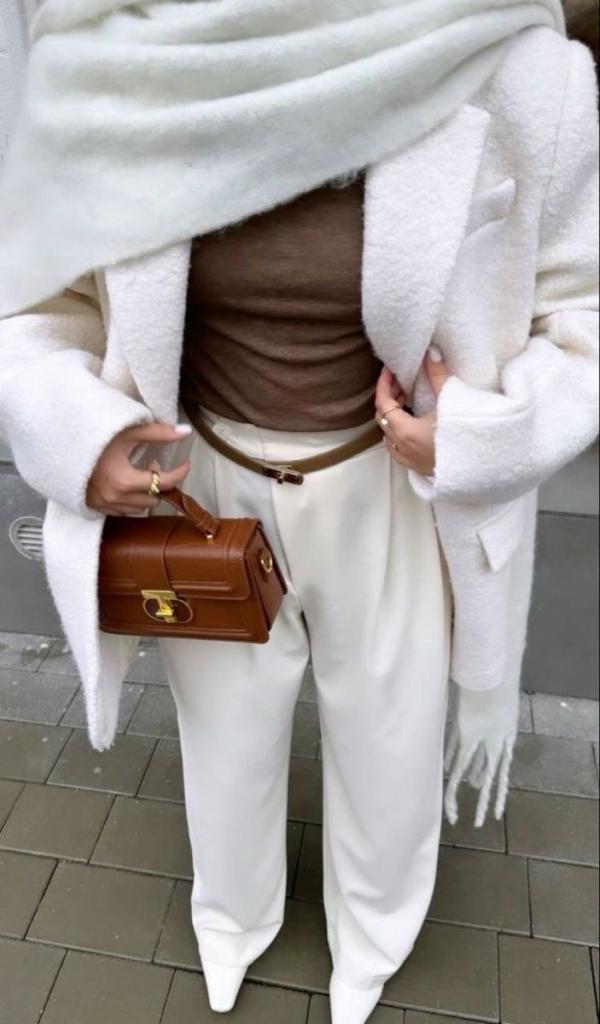 Якщо хочеться виглядати стримано та дуже витончено, я поєдную біле пальто з чорними штанами із завищеною талією та класичною водолазкою. Образ виходить універсальний: і на роботу, і на зустріч, і на важливу подію.