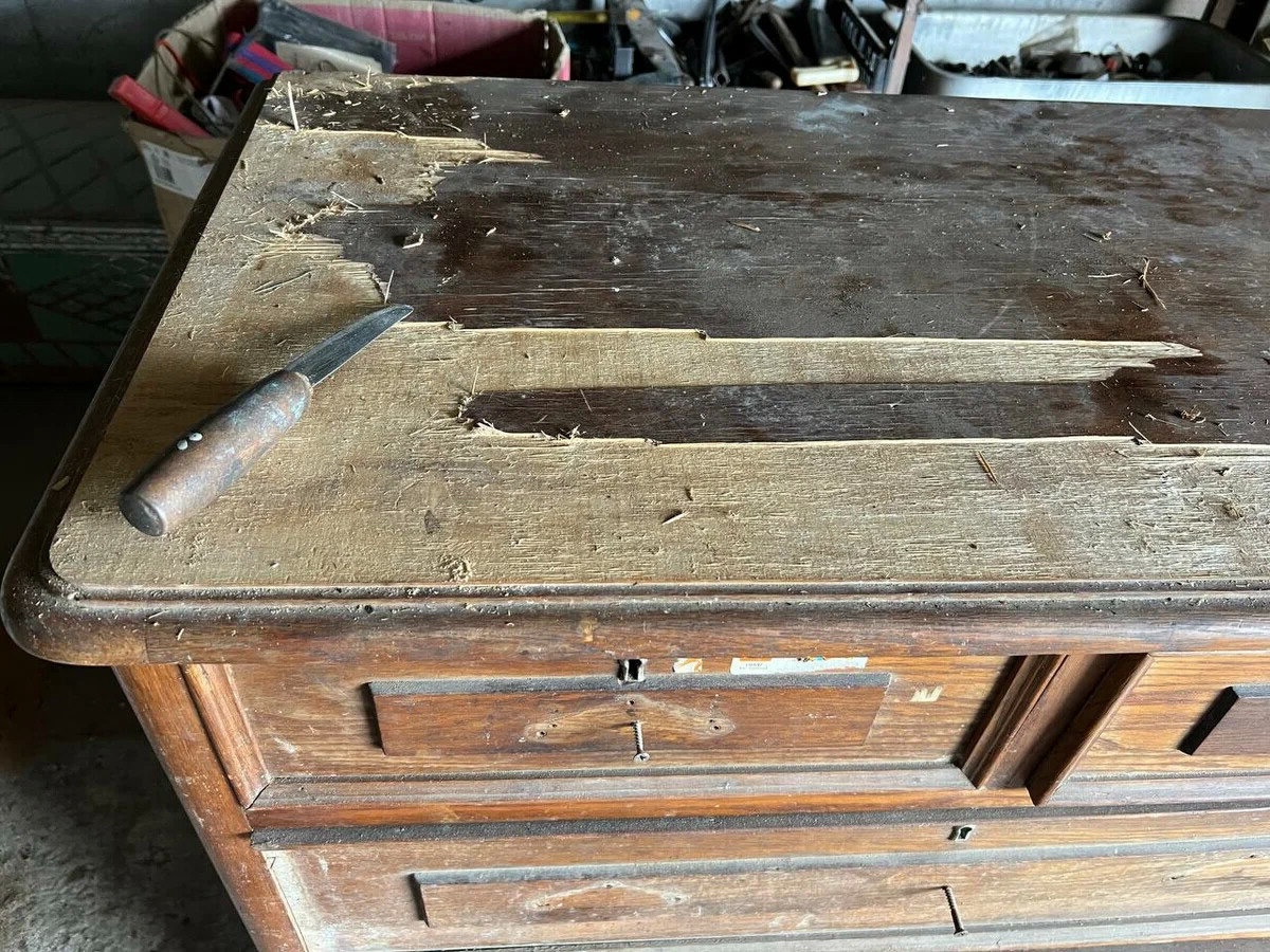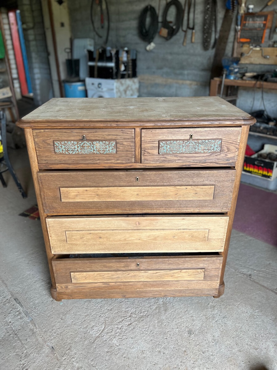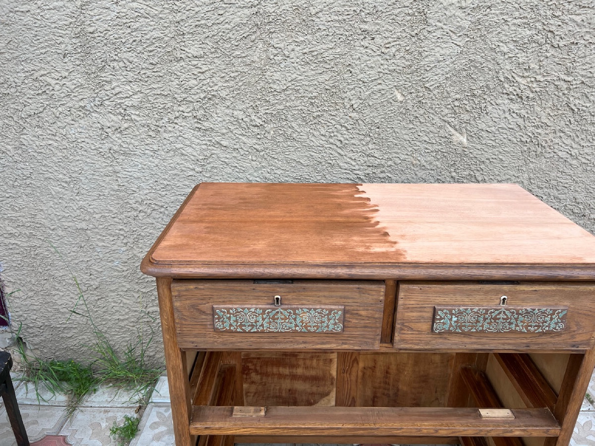 Вона провела масштабний процес реставрації, який включав очищення, зняття старого покриття, шліфування, склеювання деталей, відновлення штапиків і фарбування. Також на верхні шухляди додали декоративні елементи.