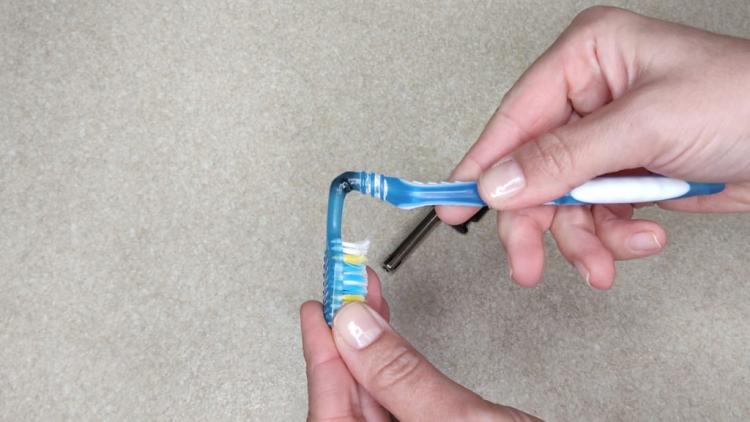 У результаті виходить компактна «подвійна щітка», яка чудово очищає вузькі проміжки. Наприклад, гребінець із частими зубцями — справжній збирач пилу та бруду. Протягнувши таку щітку між зубчиками, я очищаю його одночасно з двох боків.