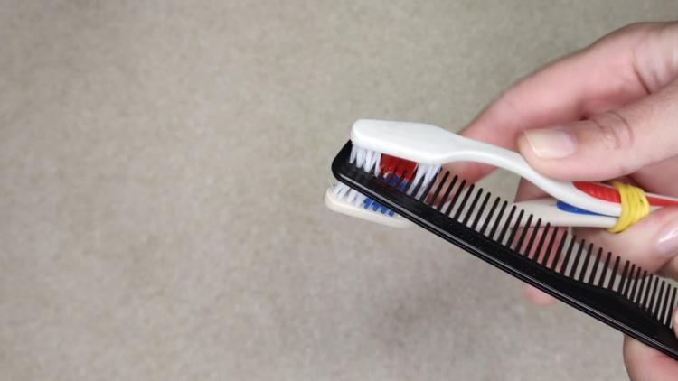 Почну з мого улюбленого лайфхаку. Я беру дві старі щітки та кілька канцелярських резинок, скріплюю їх паралельно — не надто туго, але так, щоб вони тримали форму.