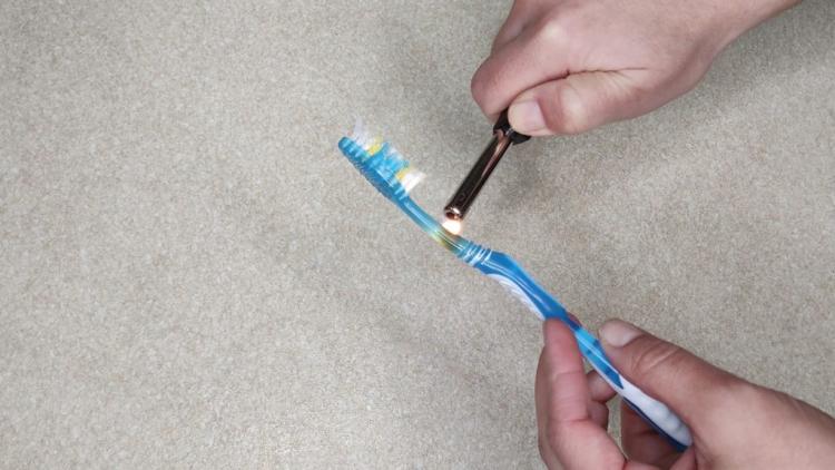Є в мене ще один прийом, який справді виручає. Беру непотрібну щітку, нагріваю її корпус запальничкою приблизно 15 секунд — лише в середній частині, не біля щетини. Коли пластик стає м’яким, обережно згинаю ручку так, щоб щетина «дивилася» всередину під кутом.