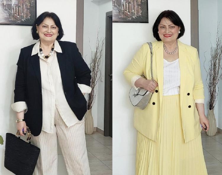 Шукайте нові варіанти стилізації навіть у зрілому віці. Замініть масивні прикраси на лаконічні аксесуари, експериментуйте з фактурами та стилями — наприклад, класичний жакет поєднайте з футболкою з принтом або плісировану спідницю з актуальним взуттям. Тренди варто знати, але підлаштовувати їх під себе, а не копіювати бездумно.